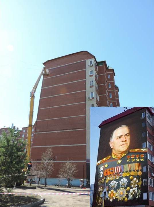 К 70-летию Великой Победы известный уфимцам художник-граффитист Олег Кайбышев готовит презентовать горожанам очередной необычный подарок: в микрорайоне Сипайлово на фасаде дома №2 по улице М.Жукова появится портрет Маршала Советского Союза, четырежды Героя Советского Союза Георгия Константиновича Жукова.