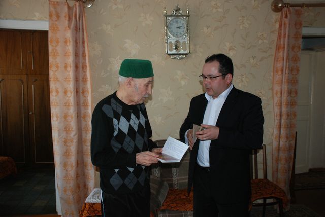 Динар Галиевич вручил Кашфелгилему Файрушевичу подарки на День Победы - термопод от столичной Администрации, а также поздравления главы Республики Башкортостан, главы Администрации г. Уфы и Администрации Кировского района г. Уфы.