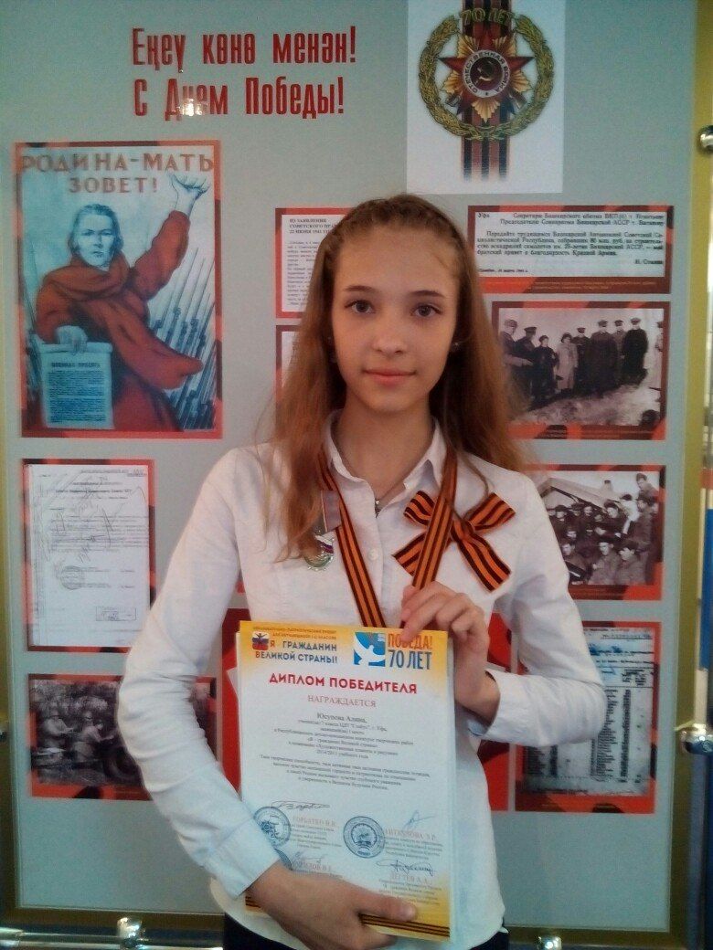 В здании Курултая РБ состоялось награждение победителей Республиканской олимпиады "Я помню. Я горжусь" и Республиканского конкурса творческих работ "Я – гражданин Великой страны". В числе победителей – обучающаяся Центра детского творчества "Глобус" Юсупова Алина.